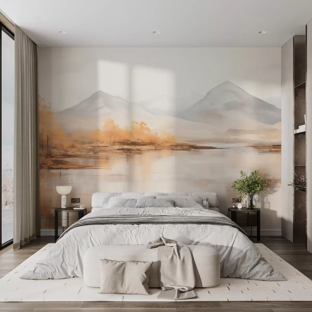 Fototapeter Høstlandskap med gule trær og en elv mot en fjellkulisse Nr. w09020