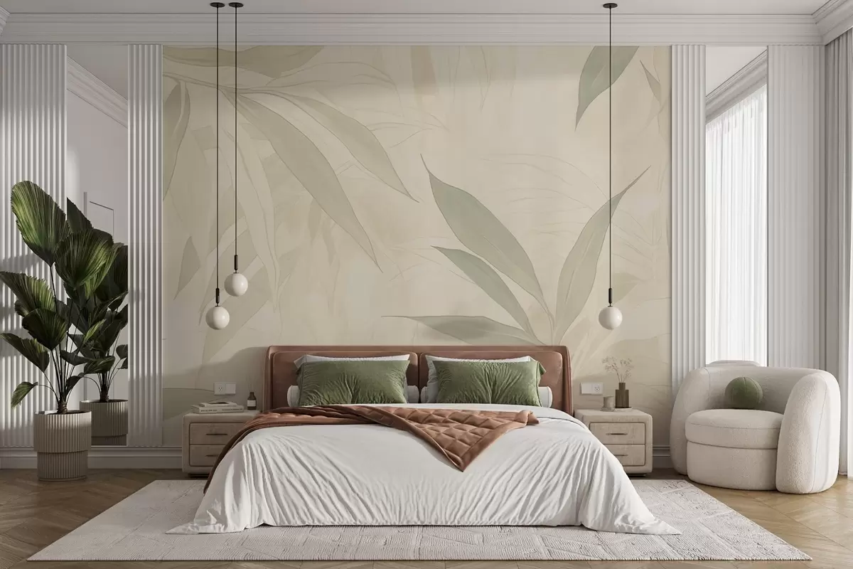 Fototapeter Grener med blader i duse grønne toner på en beige bakgrunn Nr. w09027