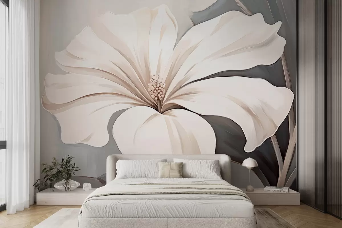 Fototapeter Stor hvit blomst med kronblader på blågrå bakgrunn Nr. w09033