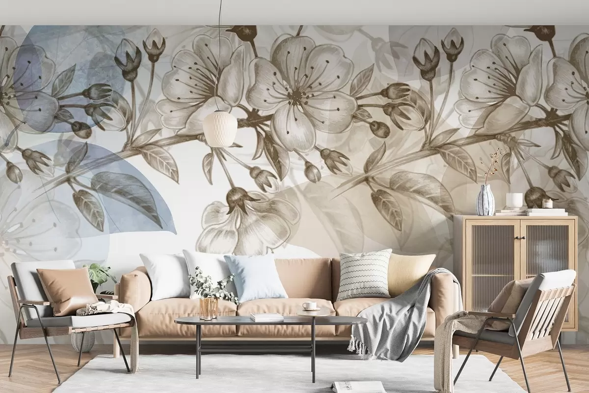 Fototapeter Kirsebærgren med blomster og knopper, sepiatoner, myk akvarellaktig bakgrunn med blå og brune fargetoner Nr. w09051