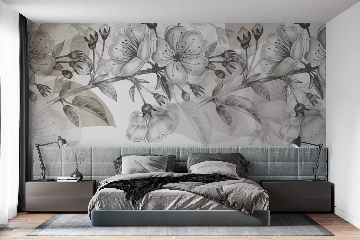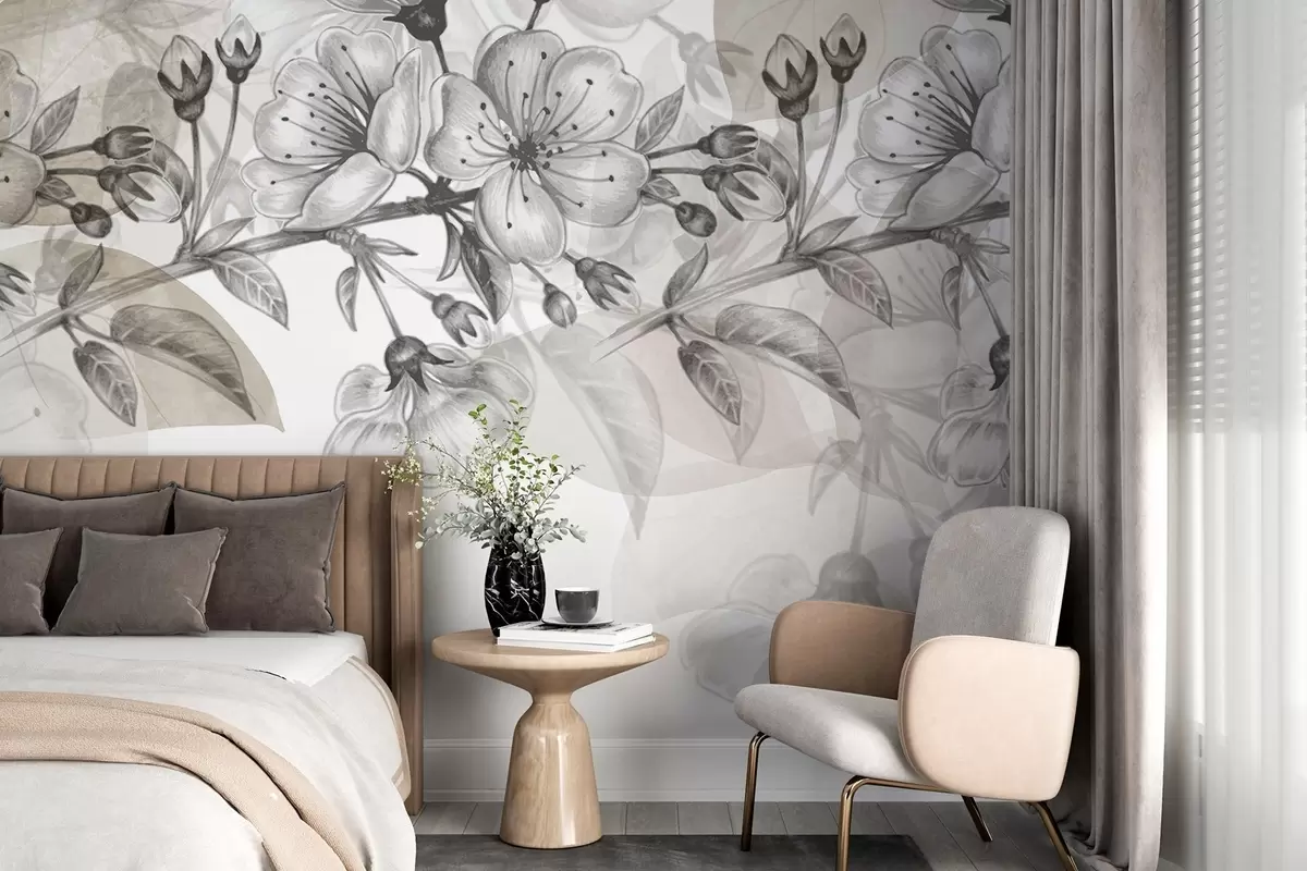 Fototapeter Kirsebærgren med blomster og knopper, sepiatoner, myk akvarellaktig bakgrunn med grå og brune fargetoner Nr. w09051v1