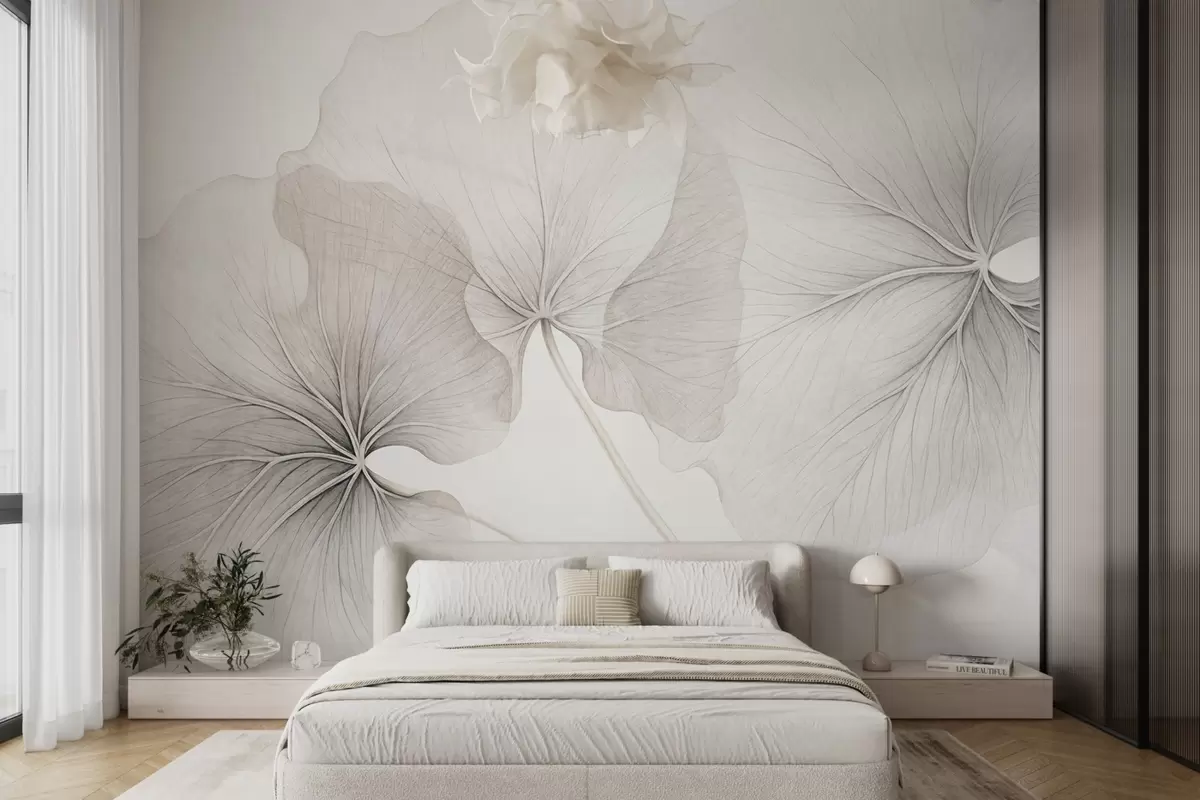 Fototapeter Tre gjennomskinnelige blader med synlige årer, med støystruktur som overlapper hverandre litt, med tynne stilker på hvit bakgrunn Nr. w09052