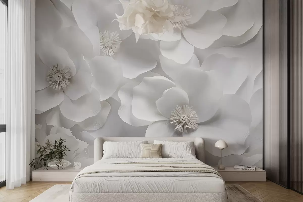 Fototapeter Hvite blomster med delikate kronblader, arrangert i en tett klynge, som skaper en følelse av renhet og eleganse på hvit bakgrunn Nr. w09053