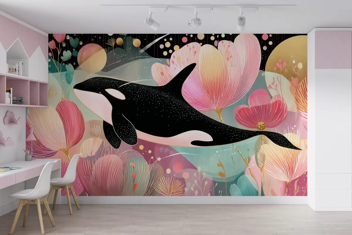 Fototapeter En svømmende svart spekkhogger mot en bakgrunn av rosa blomster Nr. w09074