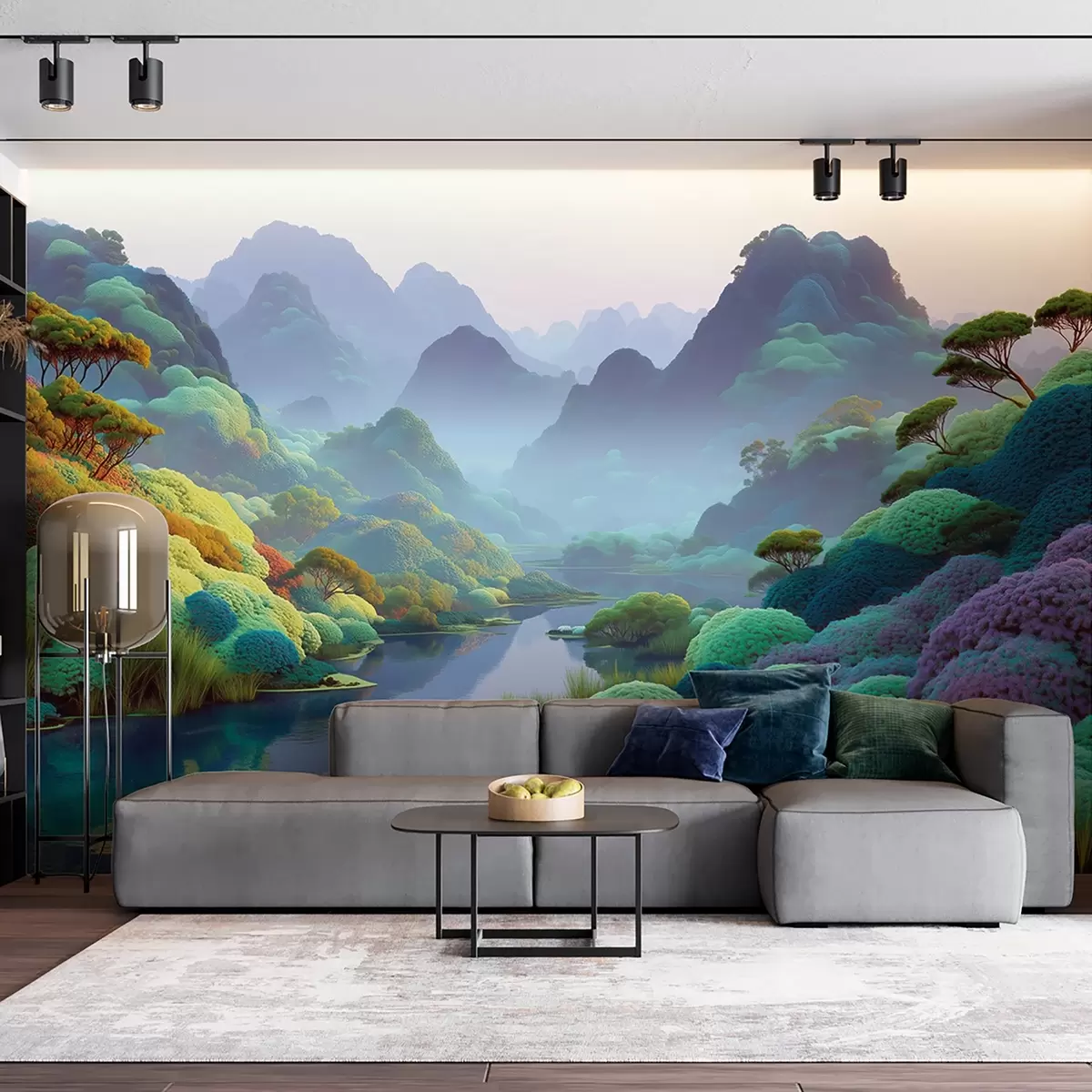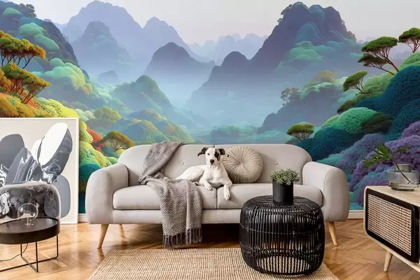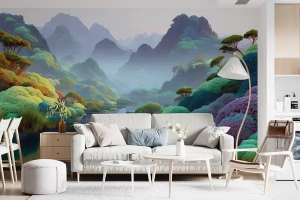 Fototapeter Fjellandskap med en elv i blå toner med trær og busker Nr. w09088