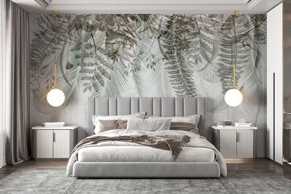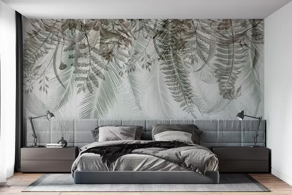 Fototapeter Delikat fallende tropisk bregne og palmeblader, geometrisk bakgrunn, mykt lys, dempede farger, elegant Nr. w09106v1