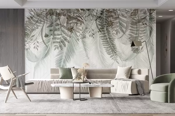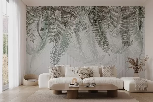 Fototapeter Delikat fallende tropisk bregne og palmeblader, geometrisk bakgrunn, mykt lys, dempede farger, elegant Nr. w09106v1