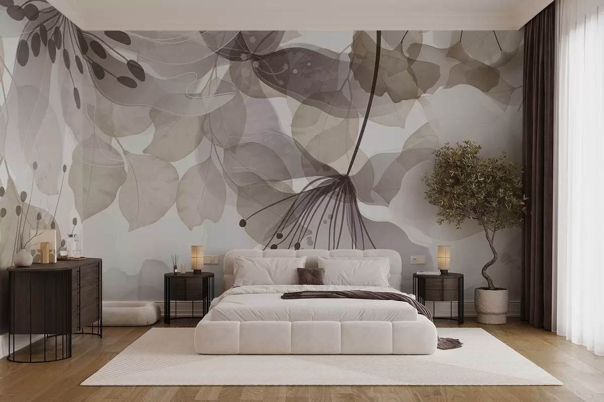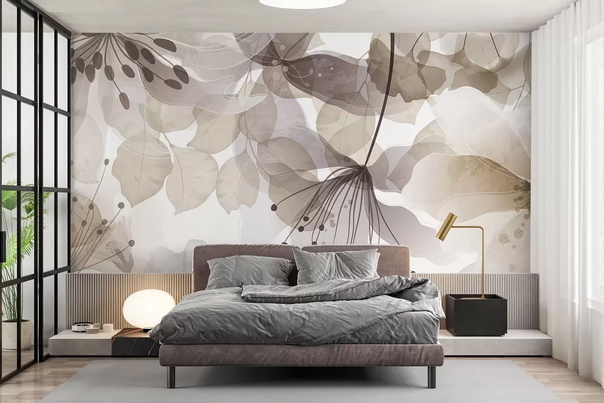 Fototapeter Blomster og blader i beige farger, gjennomskinnelige kronblader og blader, myk akvarelleffekt, delikate linjer, hvit bakgrunn Nr. w09107v1