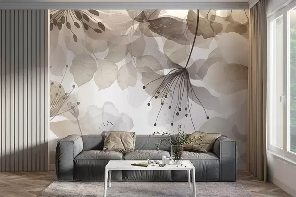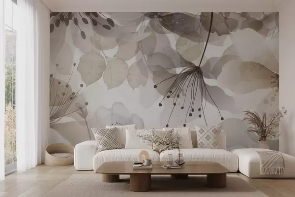 Fototapeter Blomster og blader i beige farger, gjennomskinnelige kronblader og blader, myk akvarelleffekt, delikate linjer, hvit bakgrunn Nr. w09107v1