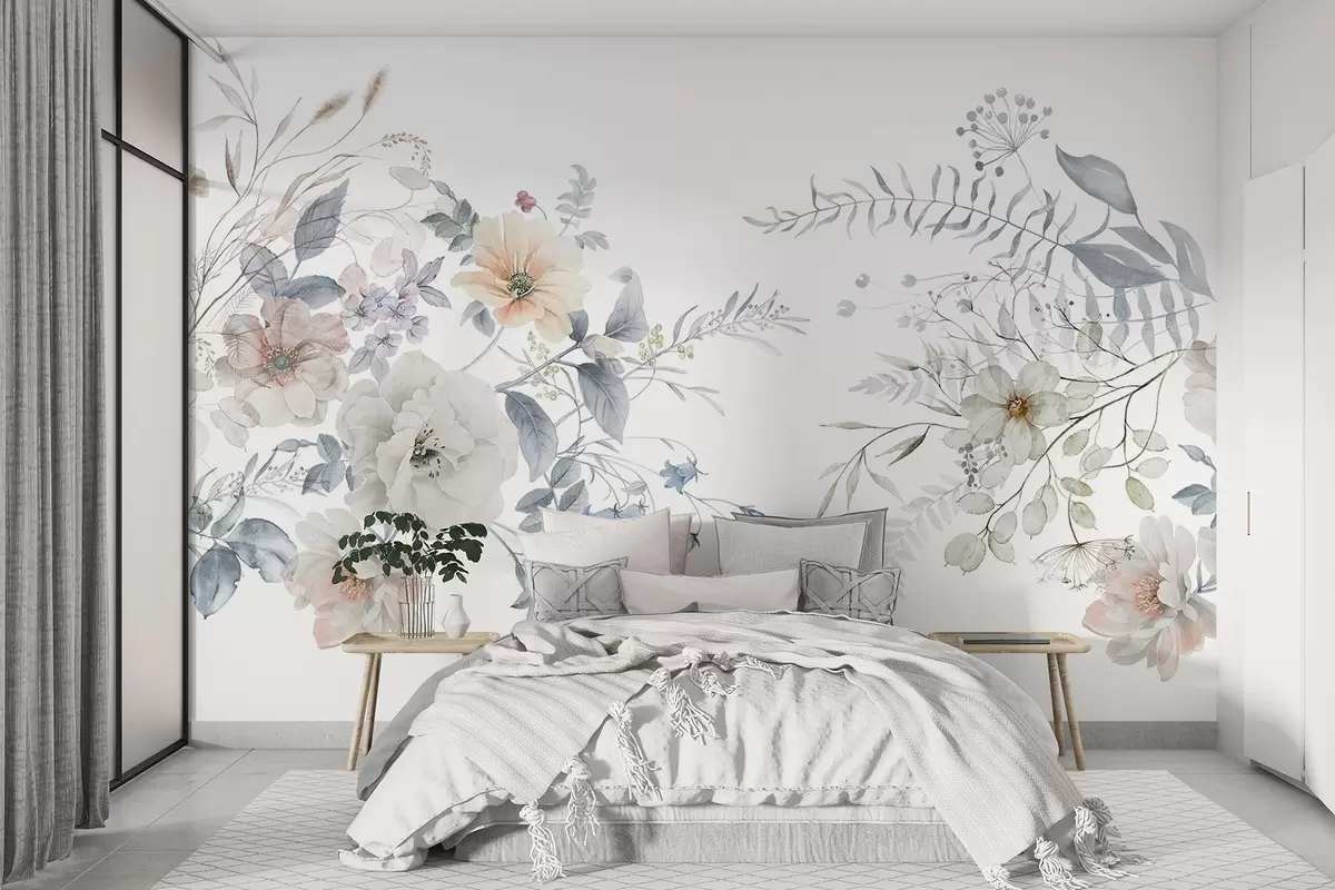 Fototapeter Blomsteroppsats i akvarellstil med hvite, ferskenfargede og blå blomster, delikat grønt på hvit bakgrunn Nr. w09108
