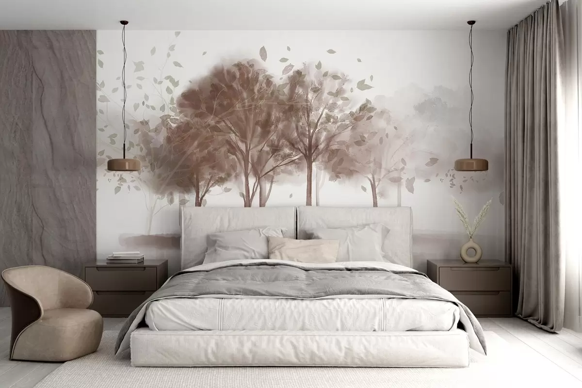 Fototapeter Abstrakt landskap med trær med brune blader som speiler seg i vannet, i akvarellteksturert stil Nr. w09109v1
