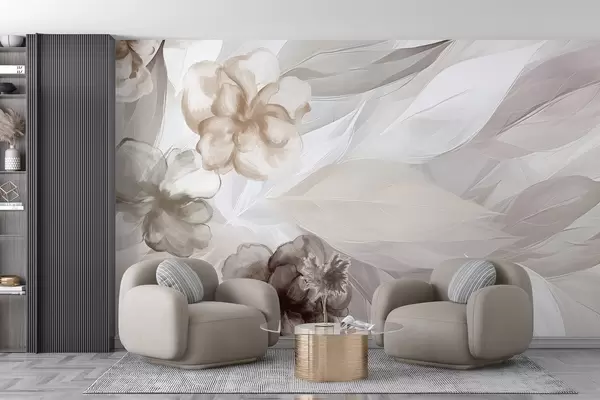 Fototapeter Delikate blomster og blader i nyanser av hvitt, brunt og beige blomsterbakgrunn, myke farger, delikate kronblader Nr. w09111v1