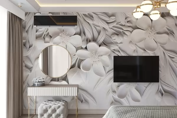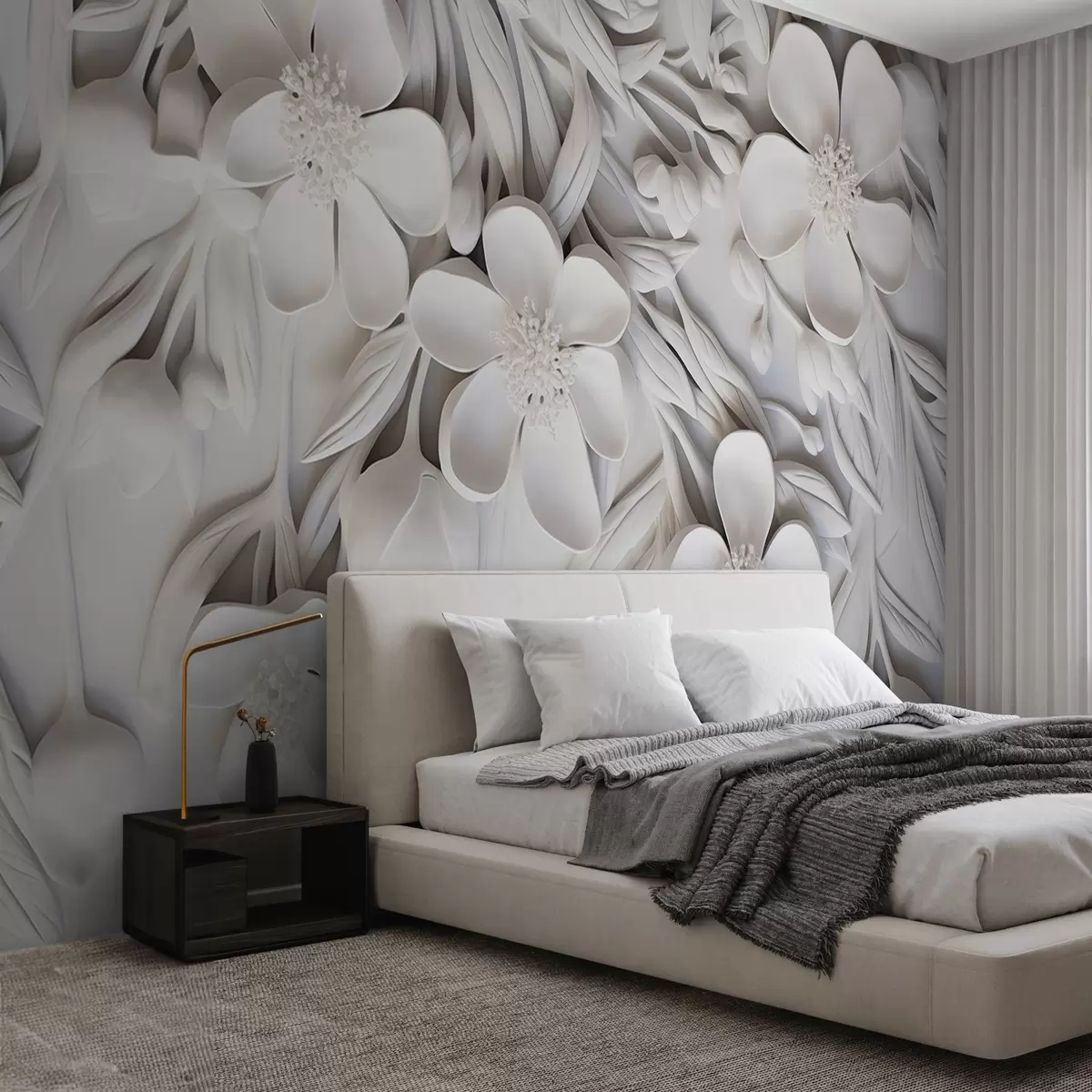 Fototapeter Hvite blomster og blader på hvit bakgrunn, blomster elegant, dekorativ design, intrikate detaljer Nr. w09113