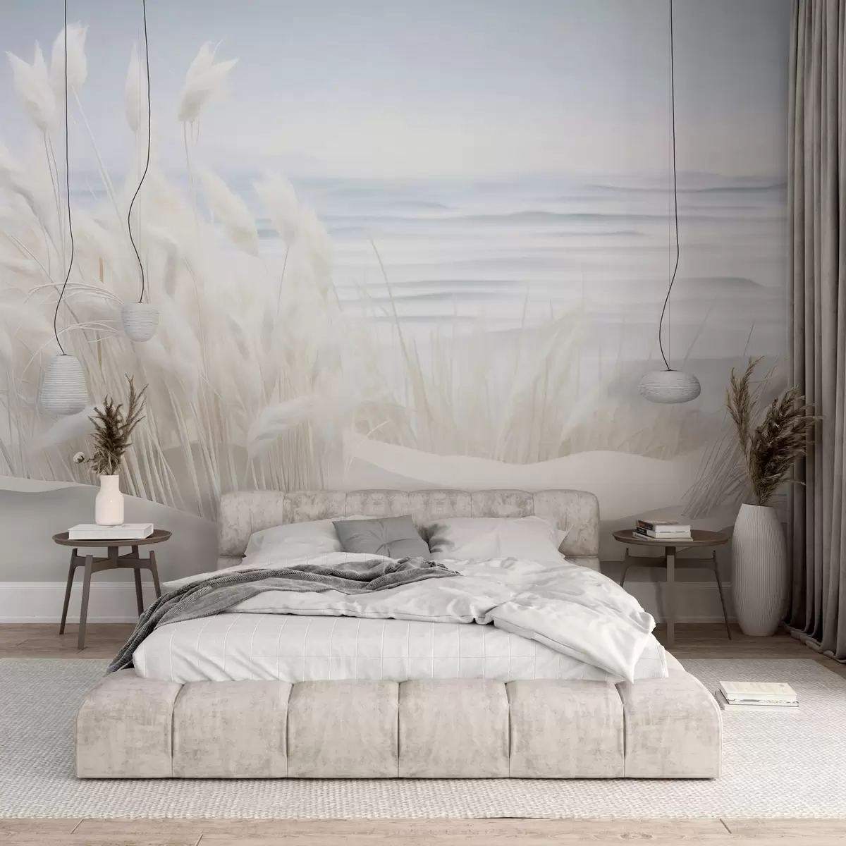 Fototapeter Landskap med hvitt pampasgress på en sanddyne, med et lyseblått hav i bakgrunnen, myk, minimalistisk stil Nr. w09132