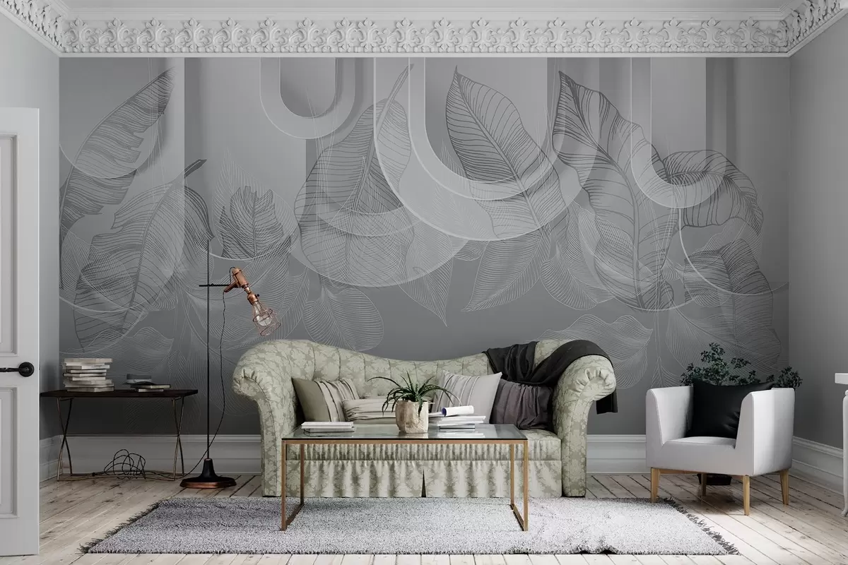 Fototapeter Abstrakt bakgrunn med grå buer og hvite tropiske blader, minimalistisk design, elegant og moderne, nøytral fargepalett Nr. w09138