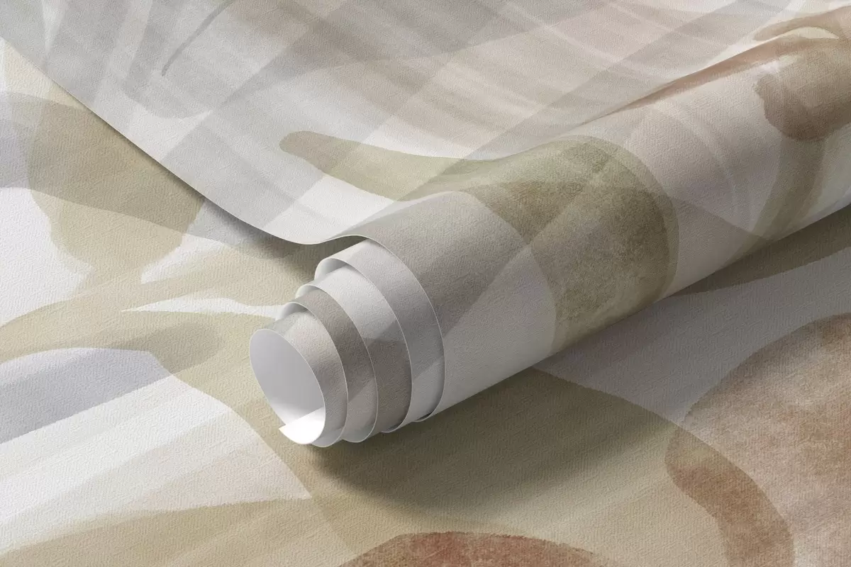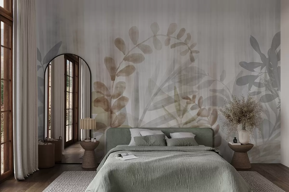 Fototapeter Akvarellmaleri med imitasjon av planter med flerfargede, dempede blader, lys bakgrunn med vertikale linjer, botanisk illustrasjon Nr. w09146