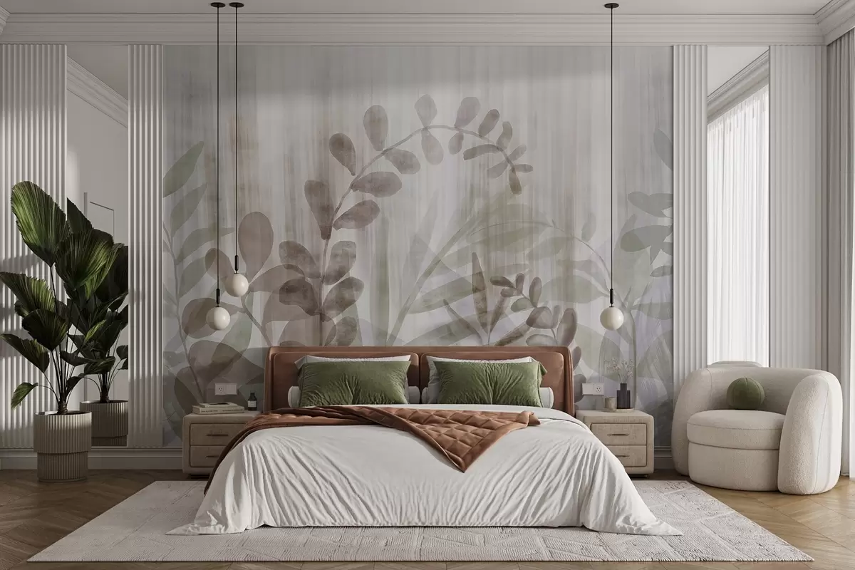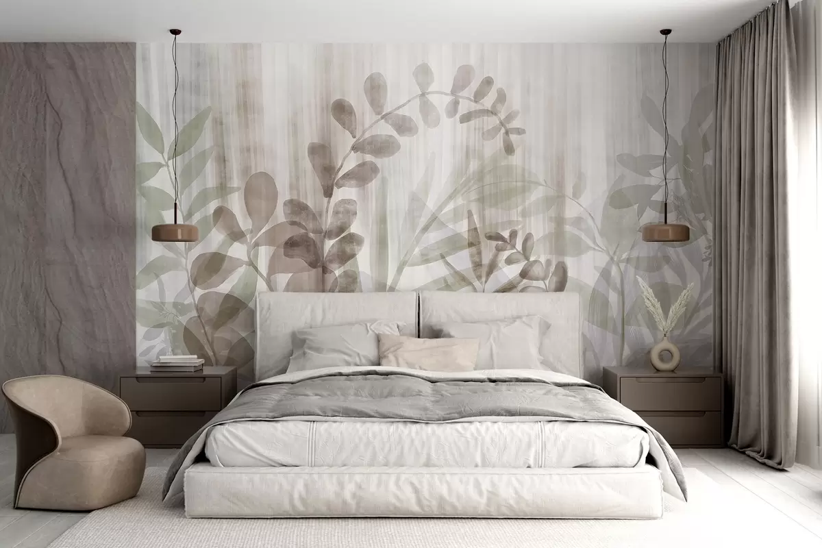 Fototapeter Akvarellmaleri med imitasjon av planter med flerfargede, dempede blader, lys bakgrunn med vertikale linjer, botanisk illustrasjon Nr. w09146v1