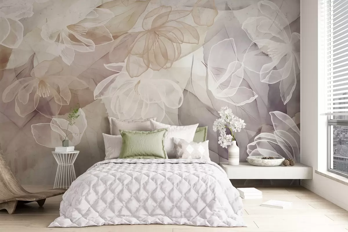 Fototapeter Blomster og blader med gjennomsiktige kronblader i nyanser av hvitt, beige og lilla, myke og delikate Nr. w09158