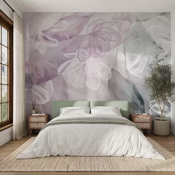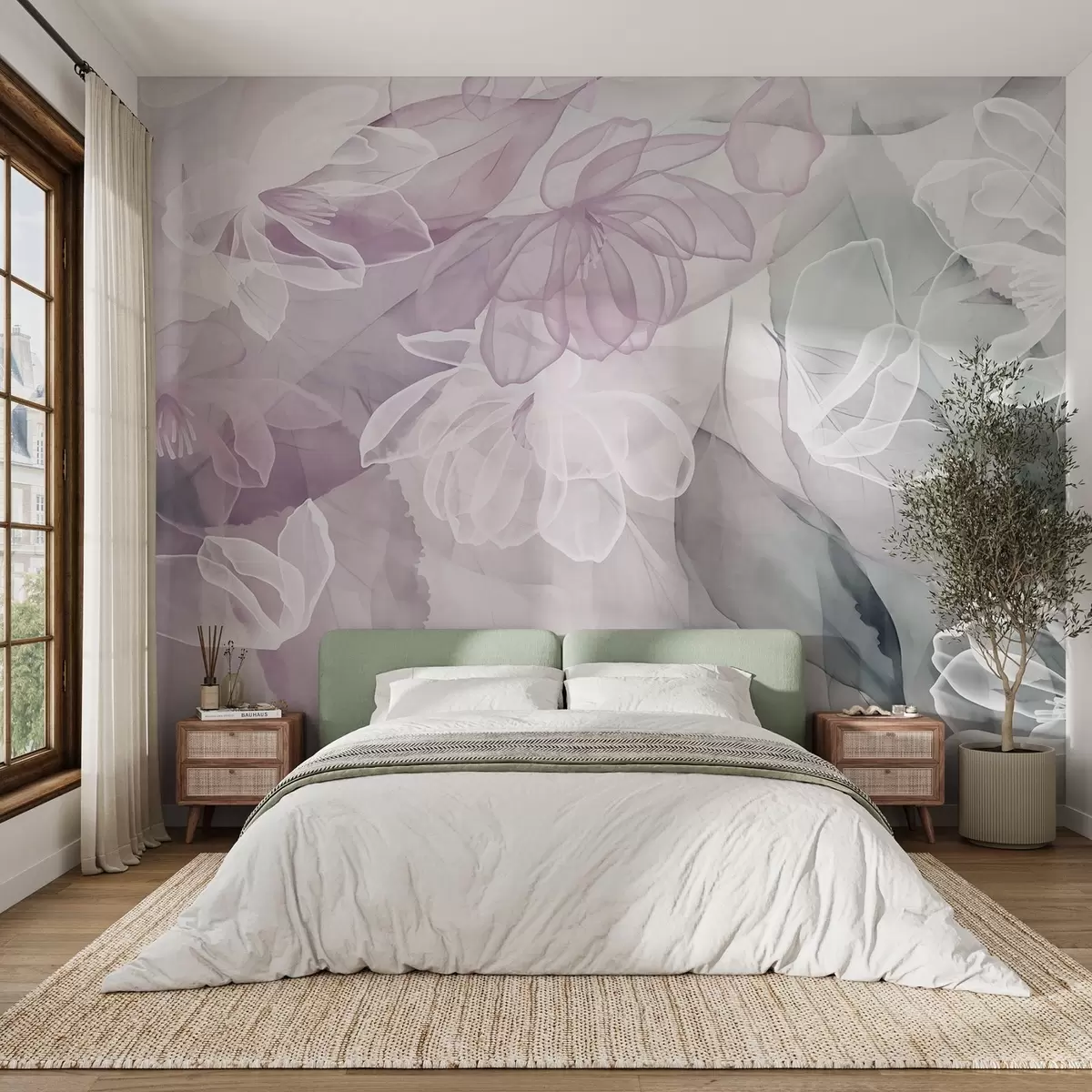 Fototapeter Blomster og blader med gjennomsiktige kronblader i nyanser av hvitt, rosa og grønt, myke og delikate Nr. w09158v1