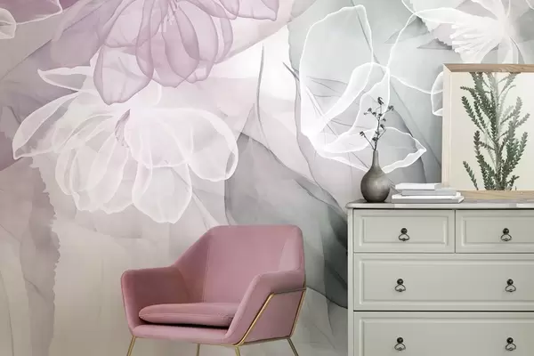 Fototapeter Blomster og blader med gjennomsiktige kronblader i nyanser av hvitt, rosa og grønt, myke og delikate Nr. w09158v1