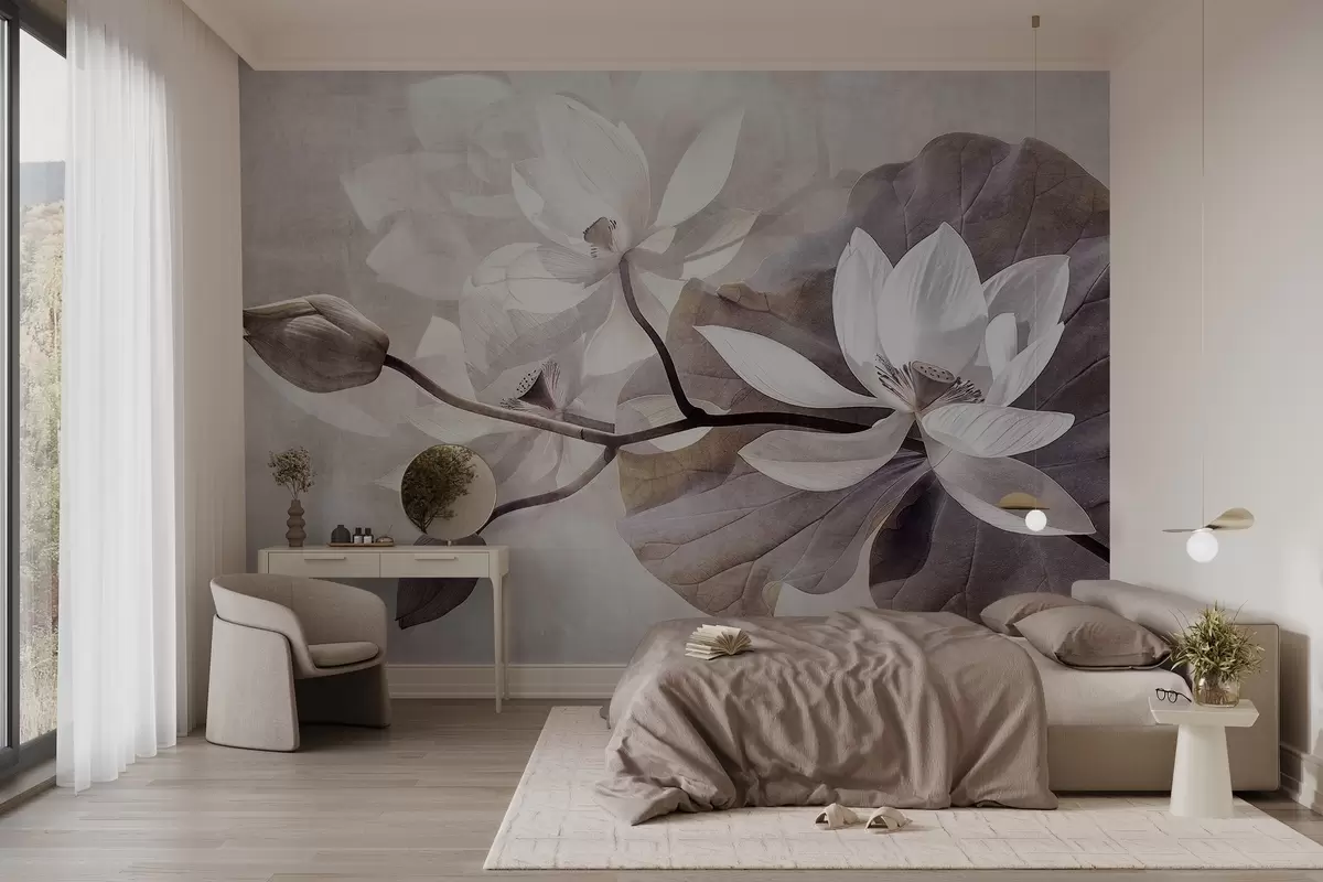 Fototapeter Kornstrukturerte, dempede, delikate lotusblomster med blader og stilker i en myk, beige fargepalett Nr. w09159