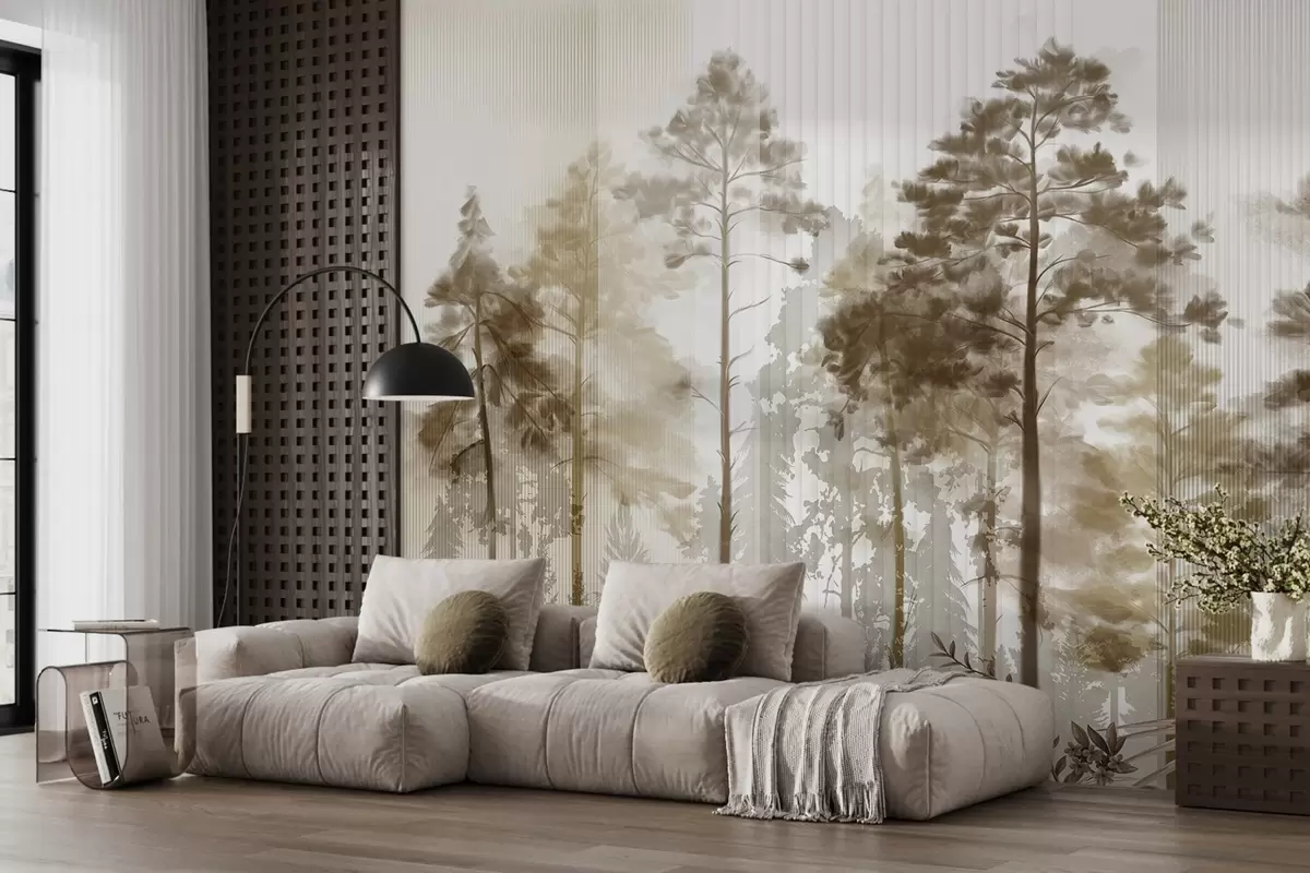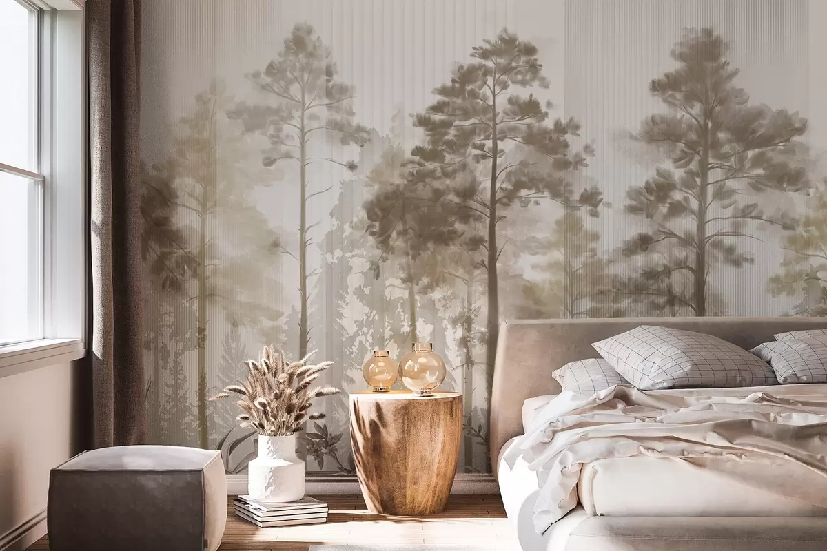 Fototapeter En tett skog med høye furutrær, frodig beige løvverk, en tåkete atmosfære med vertikale linjestrukturer Nr. w09163v1