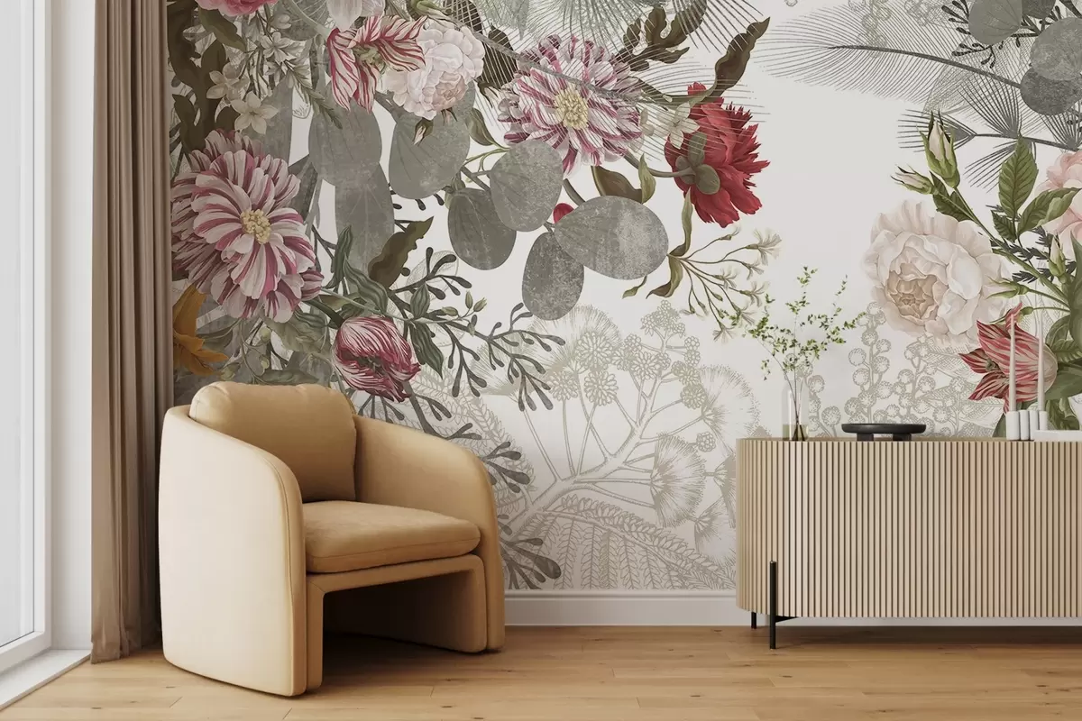 Fototapeter Vintage blomsteroppsats med roser, eukalyptus og mimosa i duse nyanser av grønt, rødt og rosa Nr. w09164v1