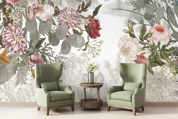 Fototapeter Vintage blomsteroppsats med roser, eukalyptus og mimosa i duse nyanser av grønt, rødt og rosa Nr. w09164v1