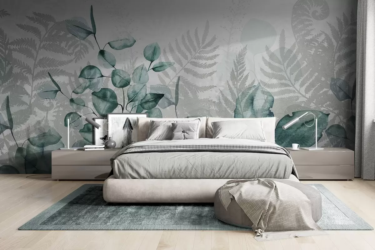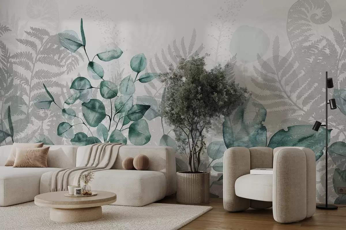 Fototapeter Eukalyptus- og bregneblader i nyanser av grønt og grått, akvarelleffekt, botanisk illustrasjon Nr. w09197