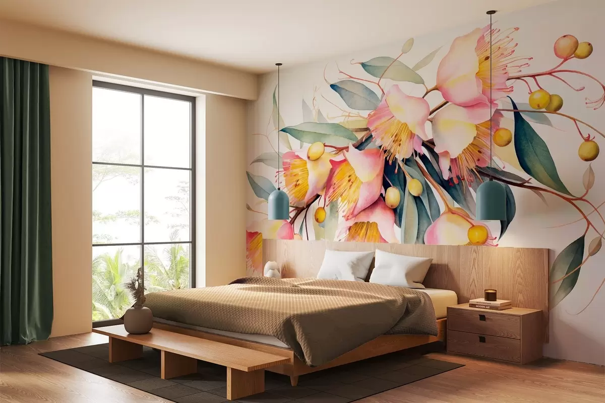 Fototapeter Eukalyptusblomster med grønne blader, akvarellstil, myk og strukturert, lys bakgrunn, botanisk blomsterdesign Nr. w09202