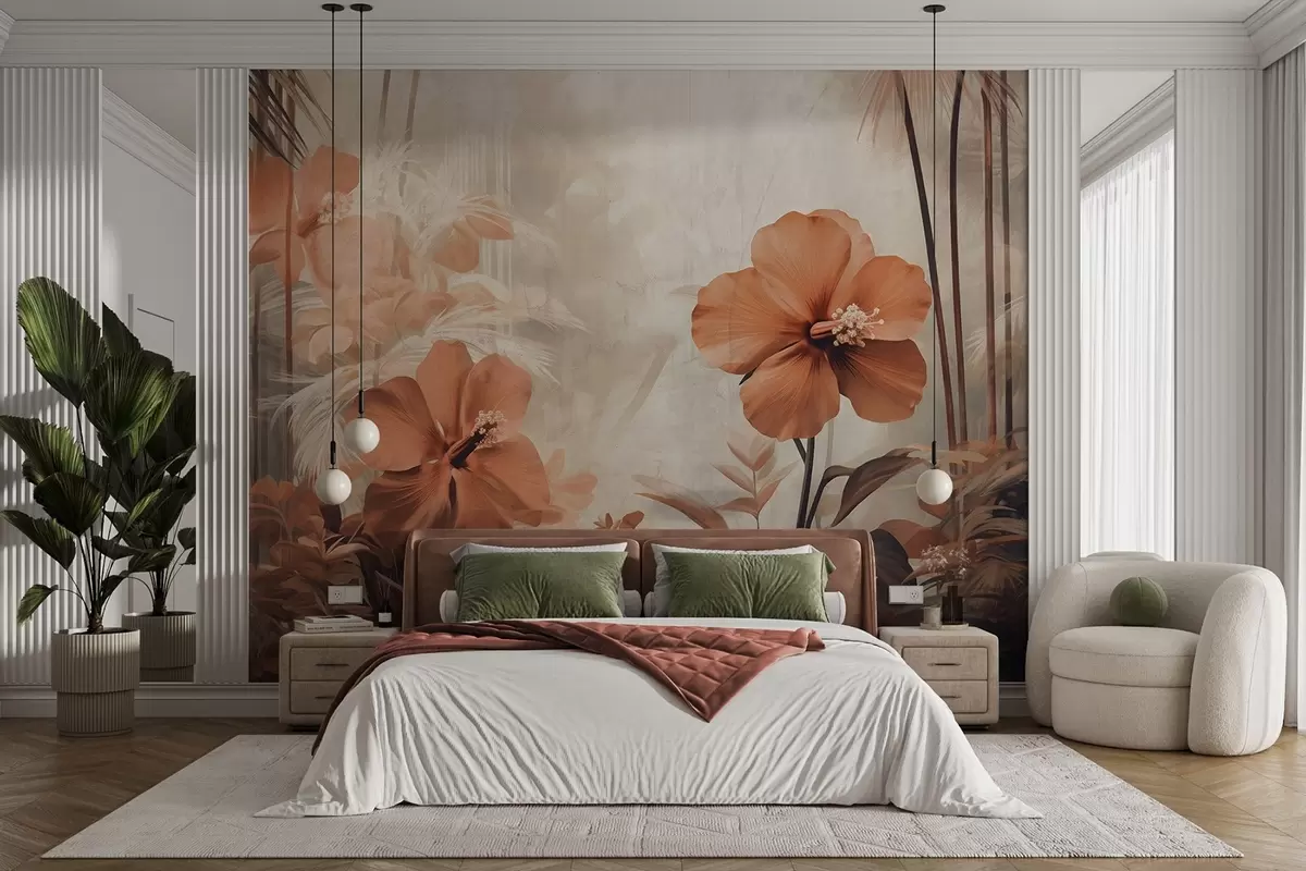 Fototapeter Pastellrøde hibiskusblomster med blader og stilker, tropisk vegetasjon, myke, dempede farger, vintage-stil Nr. w09203