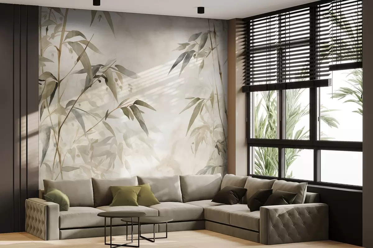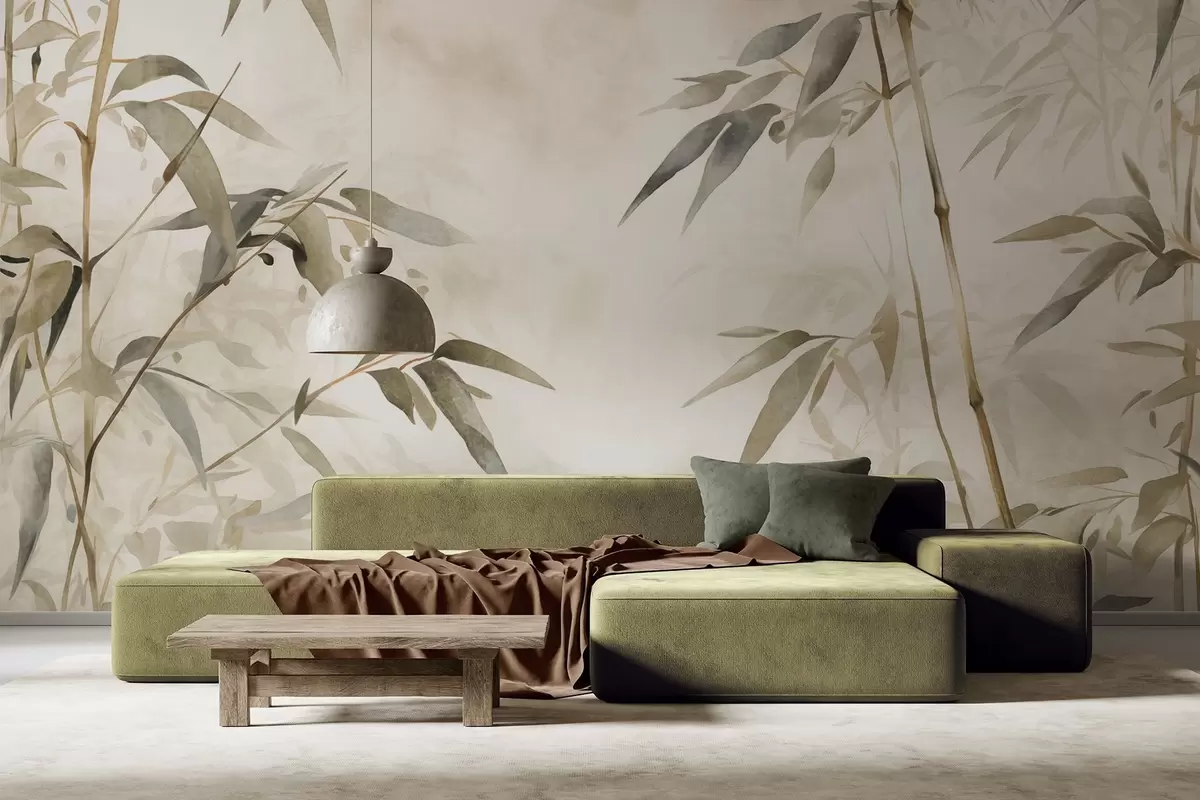 Fototapeter Bambusstrukturerte grener med blader i akvarellstil, myk, nøytral fargepalett, lys beige bakgrunn Nr. w09204