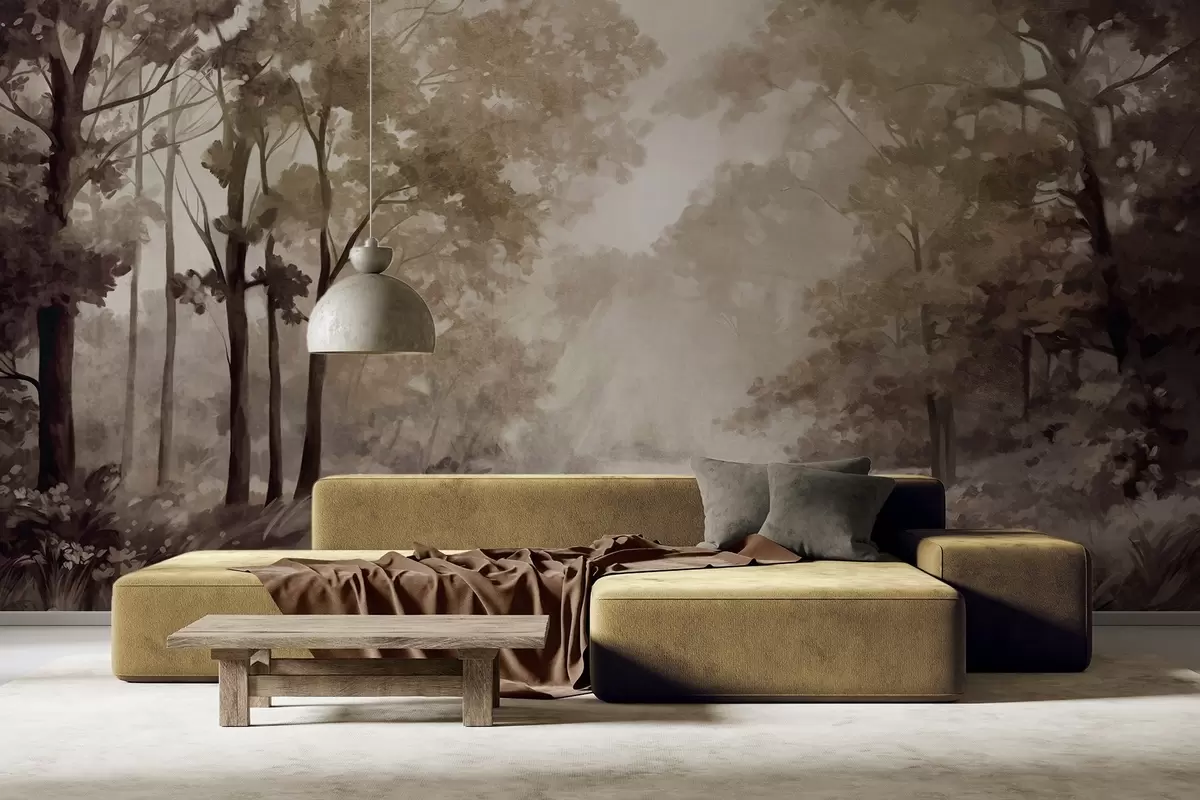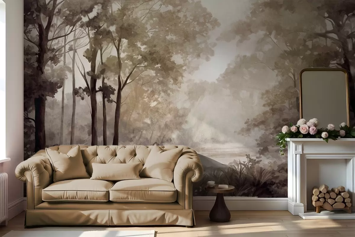 Fototapeter Strukturert skoglandskap, trær med beige og brune blader, pastellfargepalett Nr. w09210