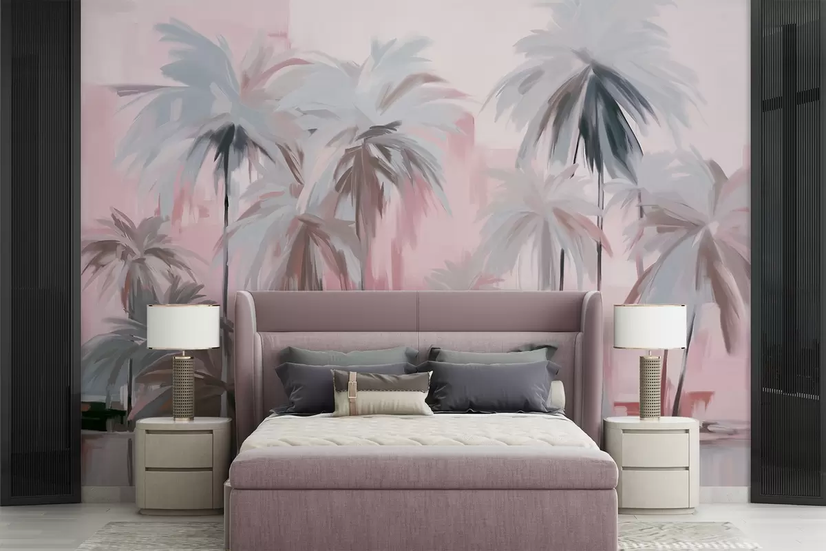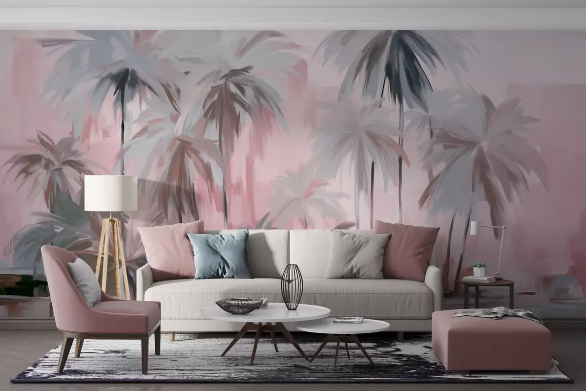 Fototapeter Abstrakte, minimalistiske pastellfargede tropiske palmer mot en bakgrunn av dempede rosa og grå fargetoner Nr. w09212v1