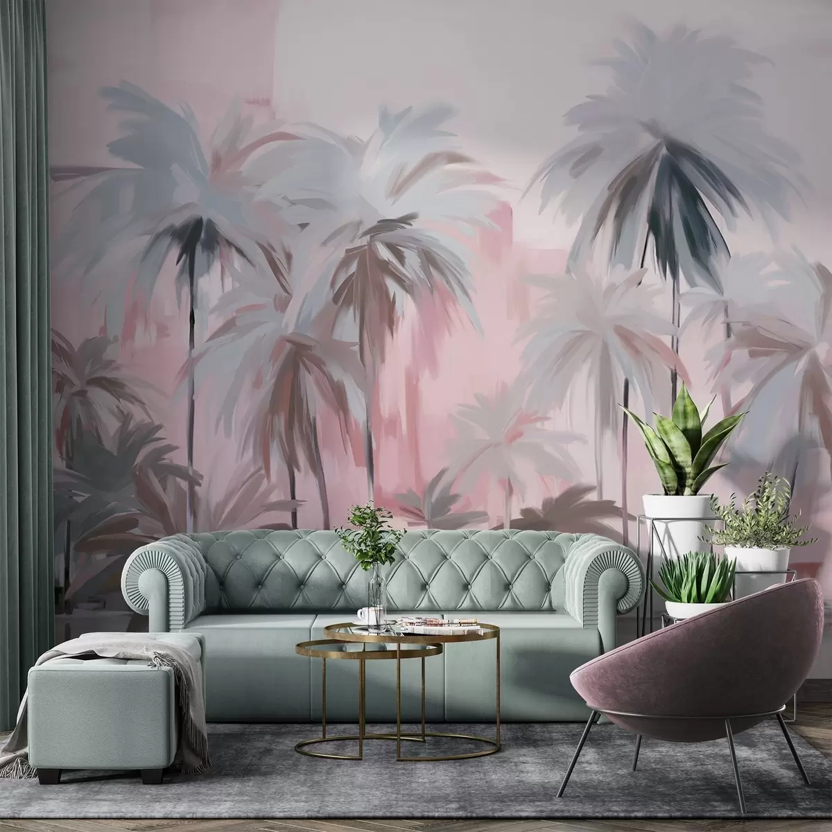 Fototapeter Abstrakte, minimalistiske pastellfargede tropiske palmer mot en bakgrunn av dempede rosa og grå fargetoner Nr. w09212v1