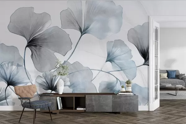 fototapeter Ginkgo biloba-blad i dempede blå og grå toner, delikat strukturert akvarelleffekt, lys bakgrunn w09215v1