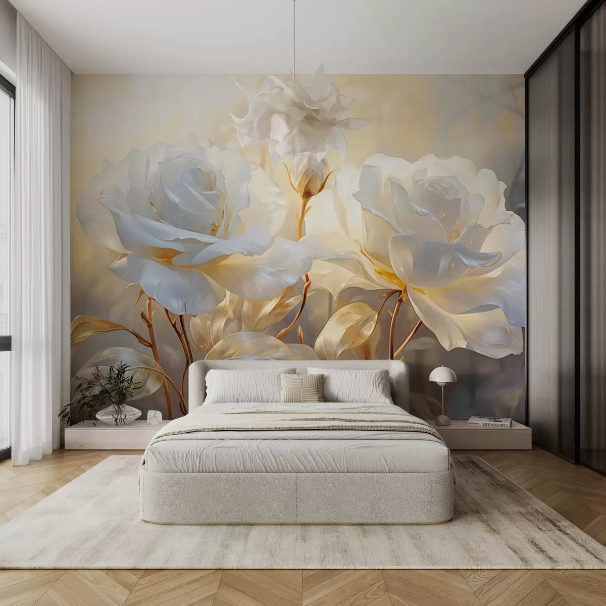 Fototapeter Hvite, strukturerte roser med gule stilker og blader, myk belysning, lys bakgrunn med uskarpe blomsterformer Nr. w09258