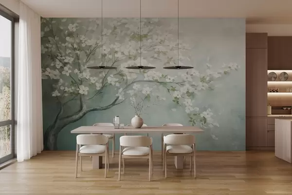 Fototapeter Et blomstrende tre med hvite blomster i full blomst, mot en kornete, støyende teksturert bakgrunn i dempet blått og grønt Nr. w09261