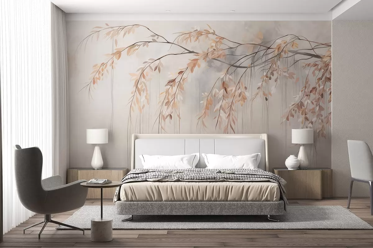 Fototapeter En gren med lys oransje blader som henger ned, lysegrå teksturert uskarp bakgrunn, myk og delikat stil Nr. w09265