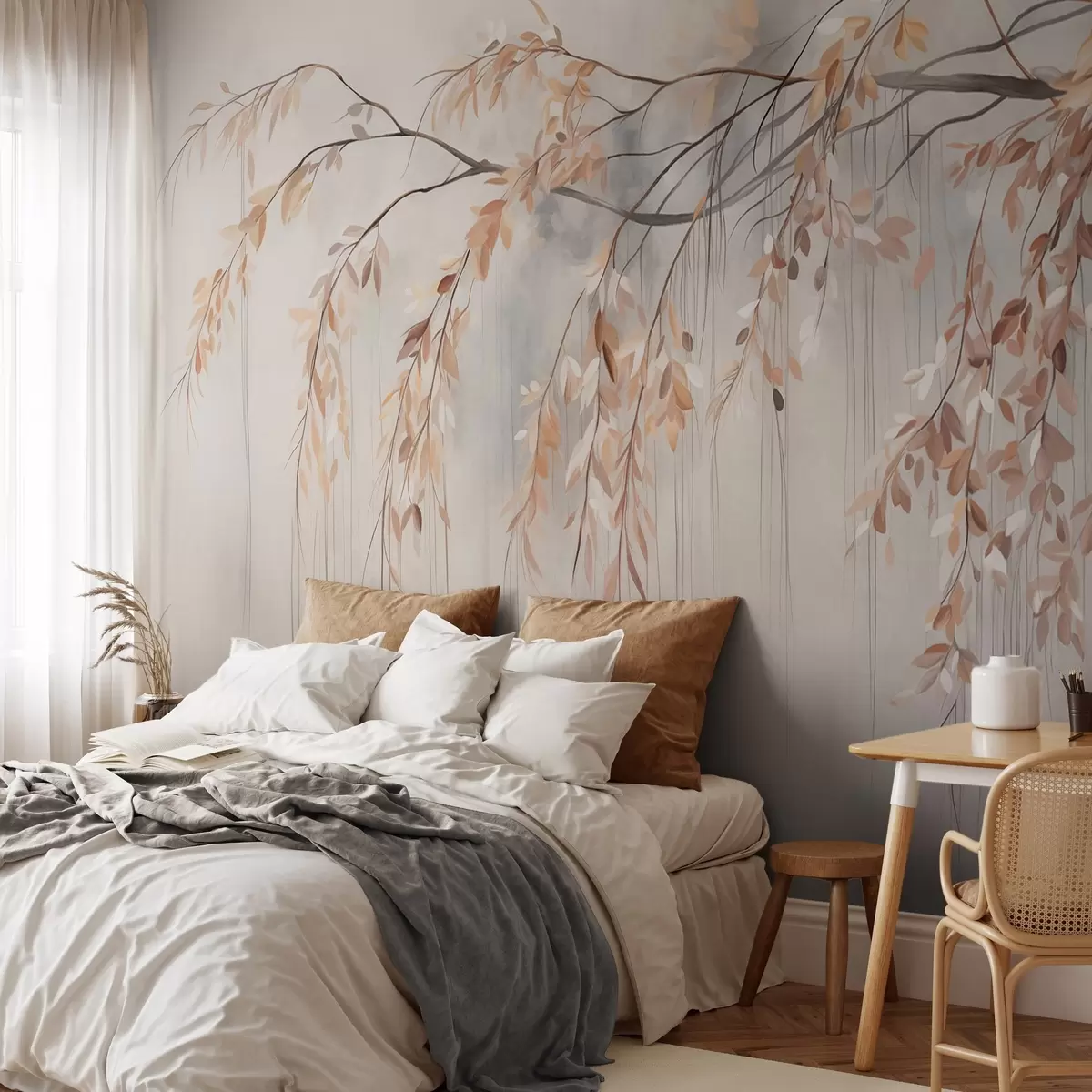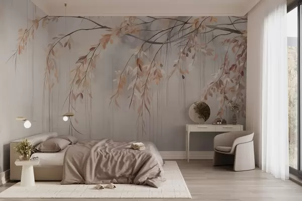 Fototapeter En gren med lys oransje blader som henger ned, lysegrå teksturert uskarp bakgrunn, myk og delikat stil Nr. w09265