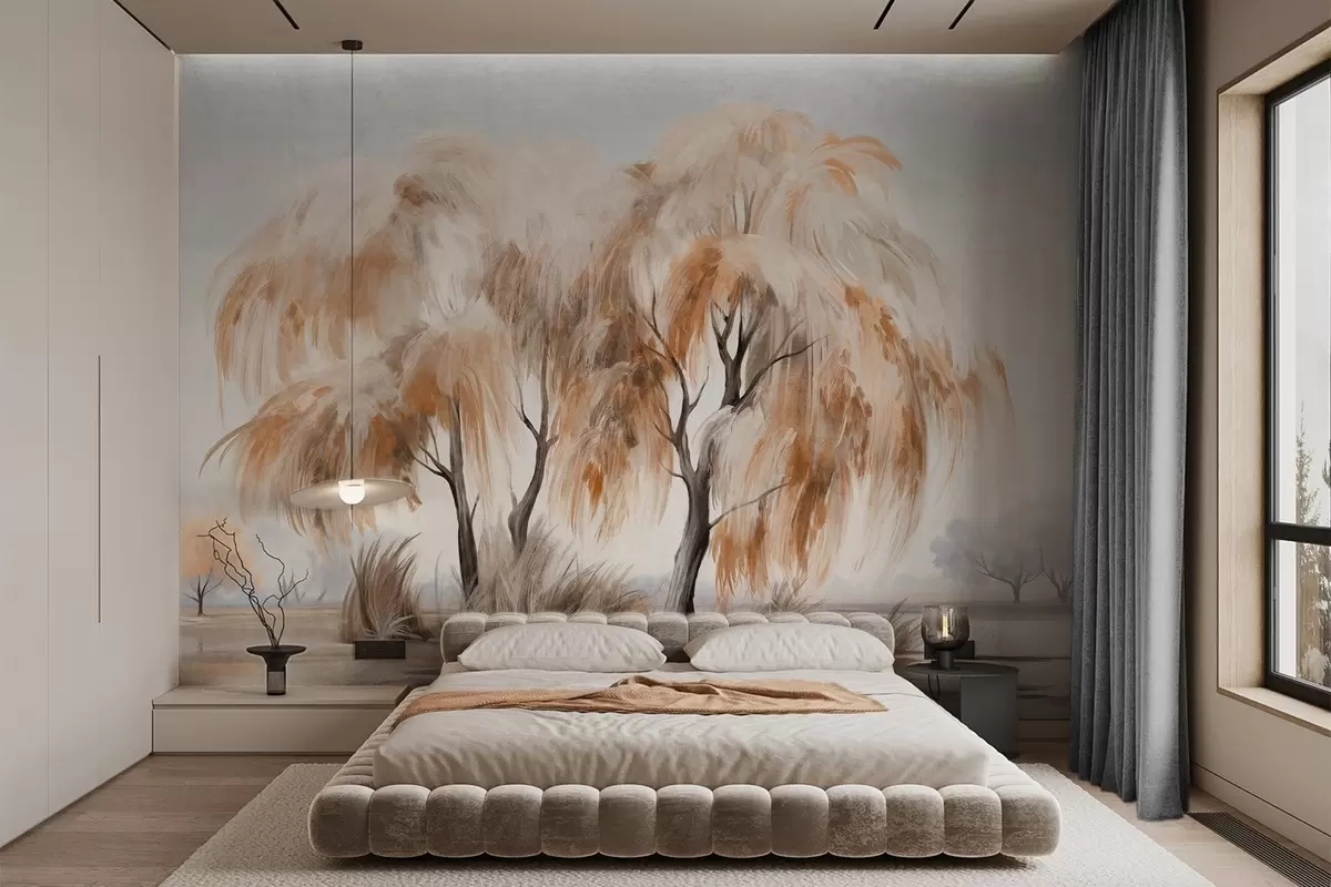 Fototapeter Strukturerte piletrær med brune og hvite blader ved bredden av en innsjø, med litt gress rundt seg, i en tåkete dag Nr. w09268