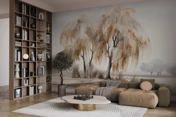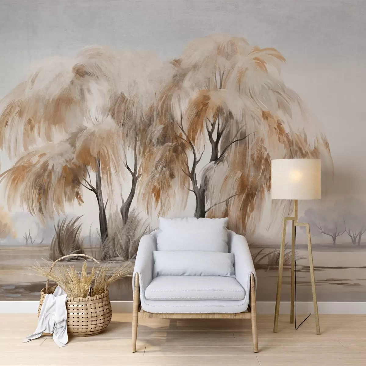 Fototapeter Strukturerte piletrær med brune og hvite blader ved bredden av en innsjø, med litt gress rundt seg, i en tåkete dag Nr. w09268