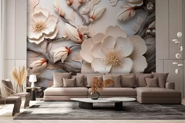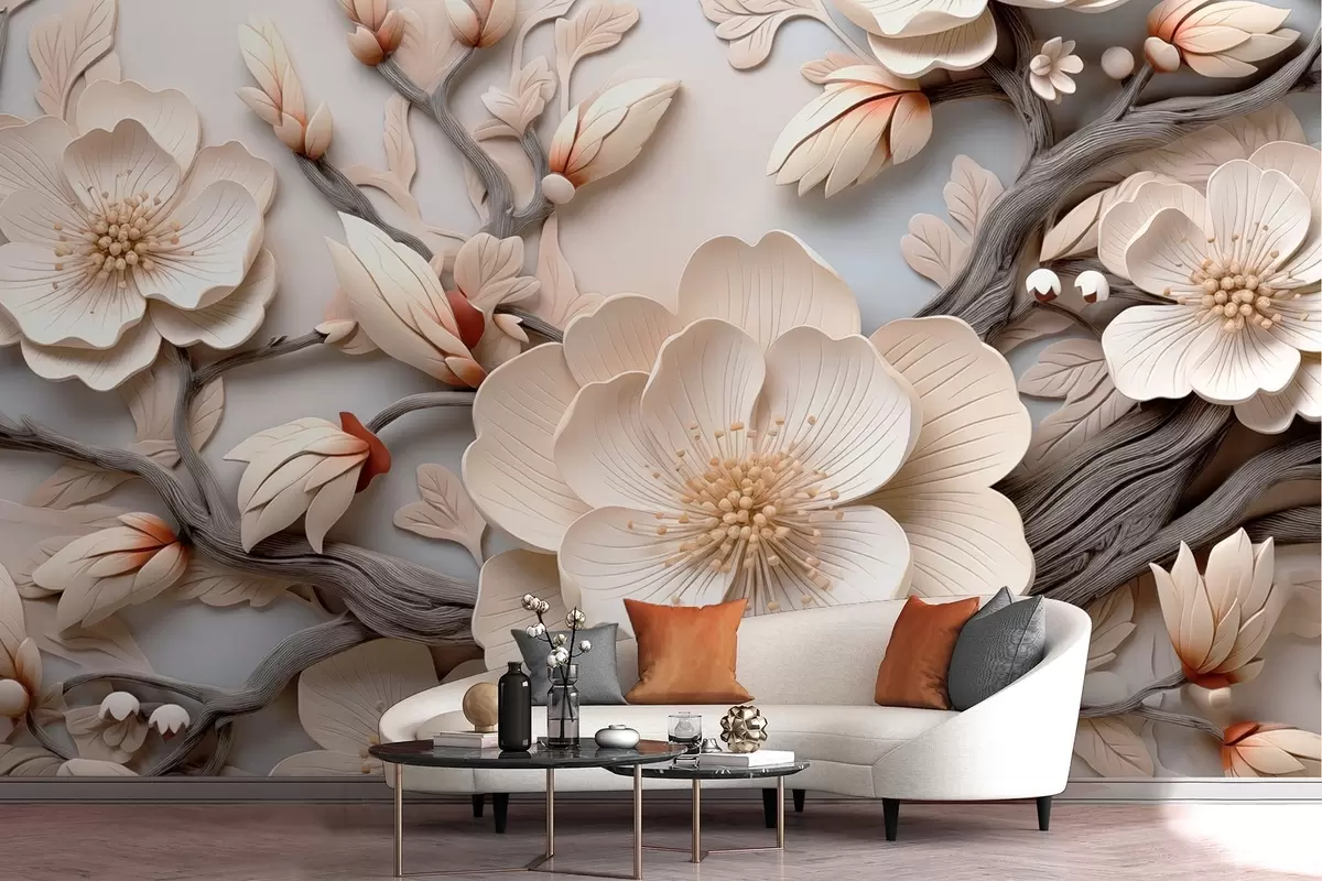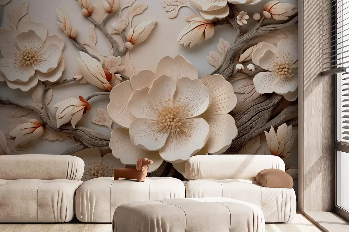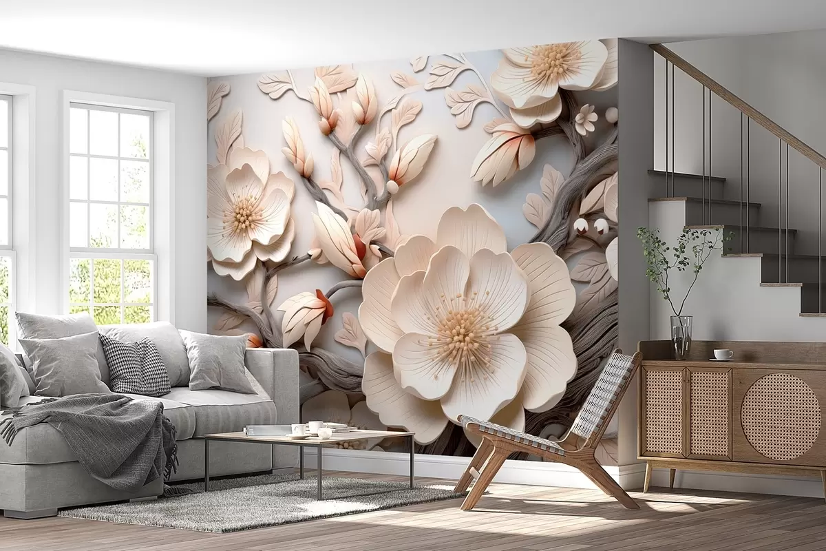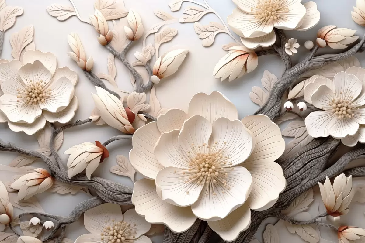 Fototapeter Volumetriske blomster og grener i lyse toner Nr. w09272