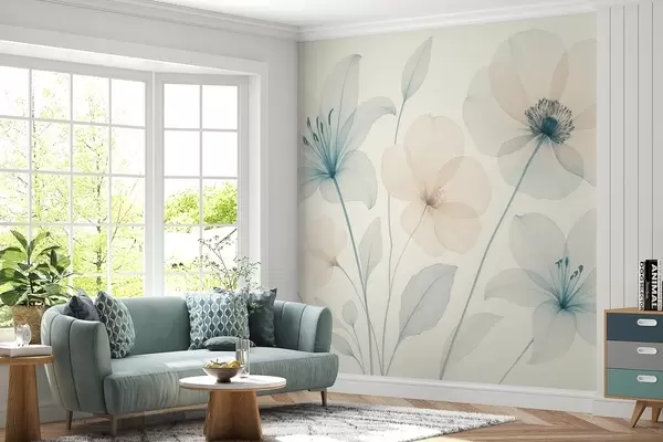 Fototapeter Delikate blomster i pastellblå og kremfarget akvarellstil Nr. w09287