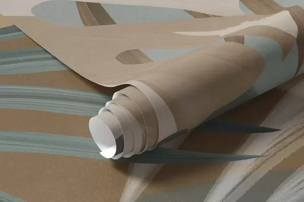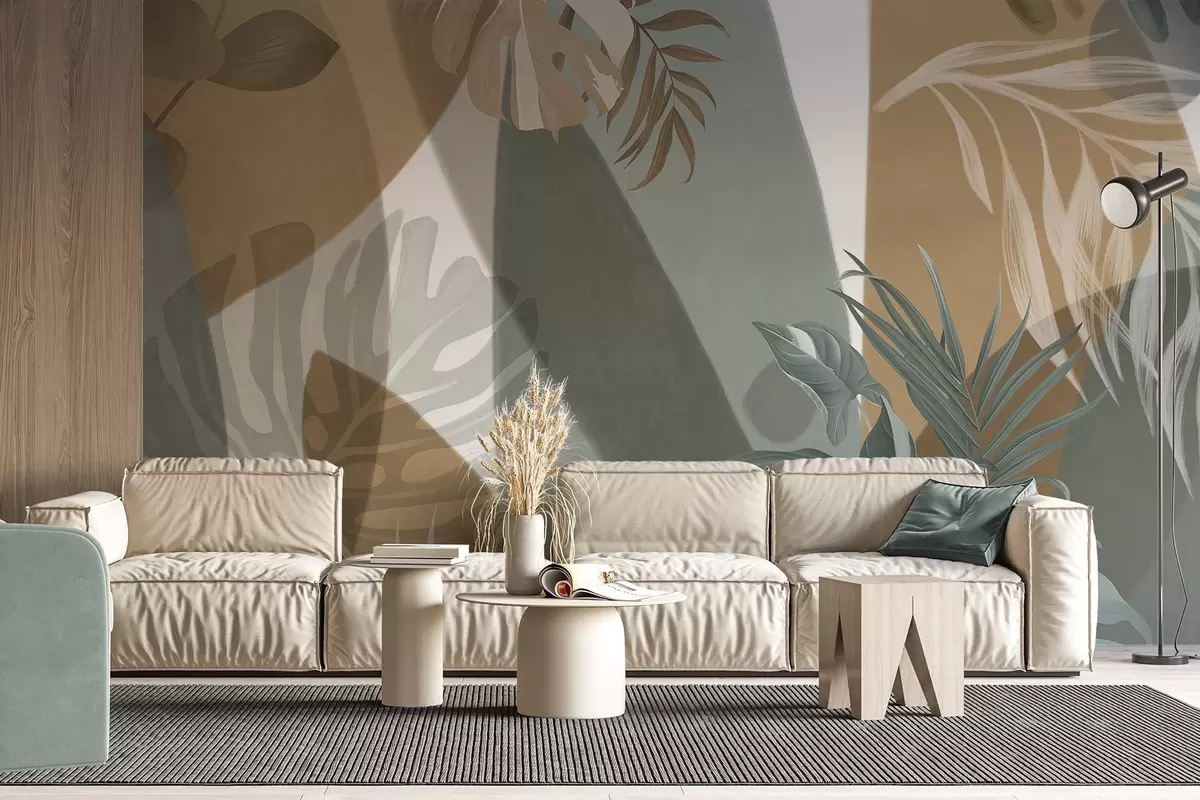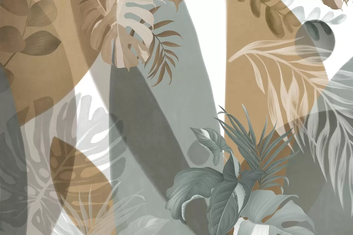 Fototapeter Monstera-blader og palmeblader i et mønster med brune, hvite og grønne farger, tropisk stemning, abstrakte former, dekorativt Nr. w09288