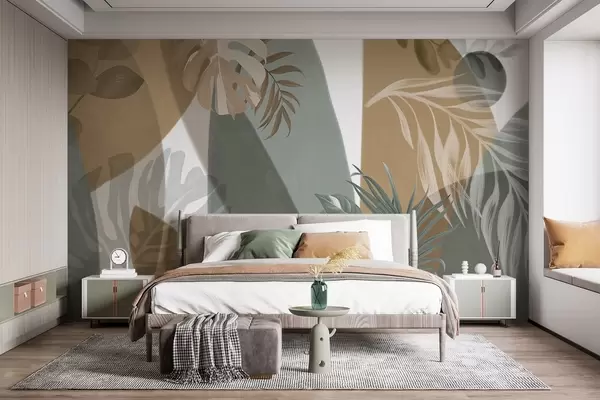 Fototapeter Monstera-blader og palmeblader i et mønster med brune, hvite og grønne farger, tropisk stemning, abstrakte former, dekorativt Nr. w09288