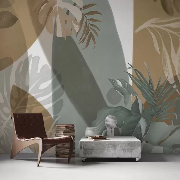 Fototapeter Monstera-blader og palmeblader i et mønster med brune, hvite og grønne farger, tropisk stemning, abstrakte former, dekorativt Nr. w09288
