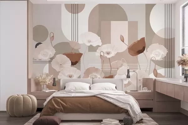 Fototapeter Valmuer i hvite og beige farger med geometriske former i bakgrunnen, sirkler og buer, minimalistisk stil, myke farger Nr. w09289