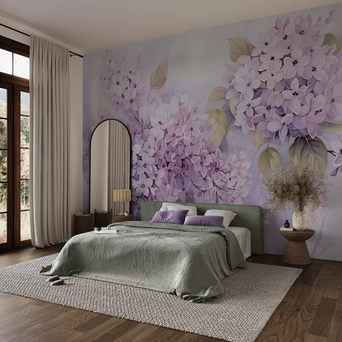Fototapeter Lilla blomster med tekstur og lyslilla kronblader, lysegrønne blader, akvarellstil, myke pastellfarger, delikate penselstrøk Nr. w09291