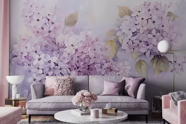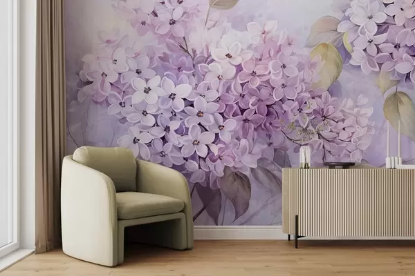 Fototapeter Lilla blomster med tekstur og lyslilla kronblader, lysegrønne blader, akvarellstil, myke pastellfarger, delikate penselstrøk Nr. w09291